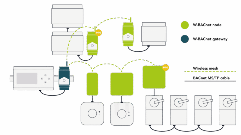 Ett W-Modbus-nätverk består av en enda W-Modbus-gateway ansluten till Modbus-klienten med en Modbus RTU-kabel och upp till 100 W-Modbus-noder. W-Modbus PRO-noderna kan anslutas till en till fyra Modbus-servrar via en Modbus RTU-kabel, jämfört med en vanlig W-Modbus-nod som kan anslutas till en server via en Modbus RTU-kabel.
