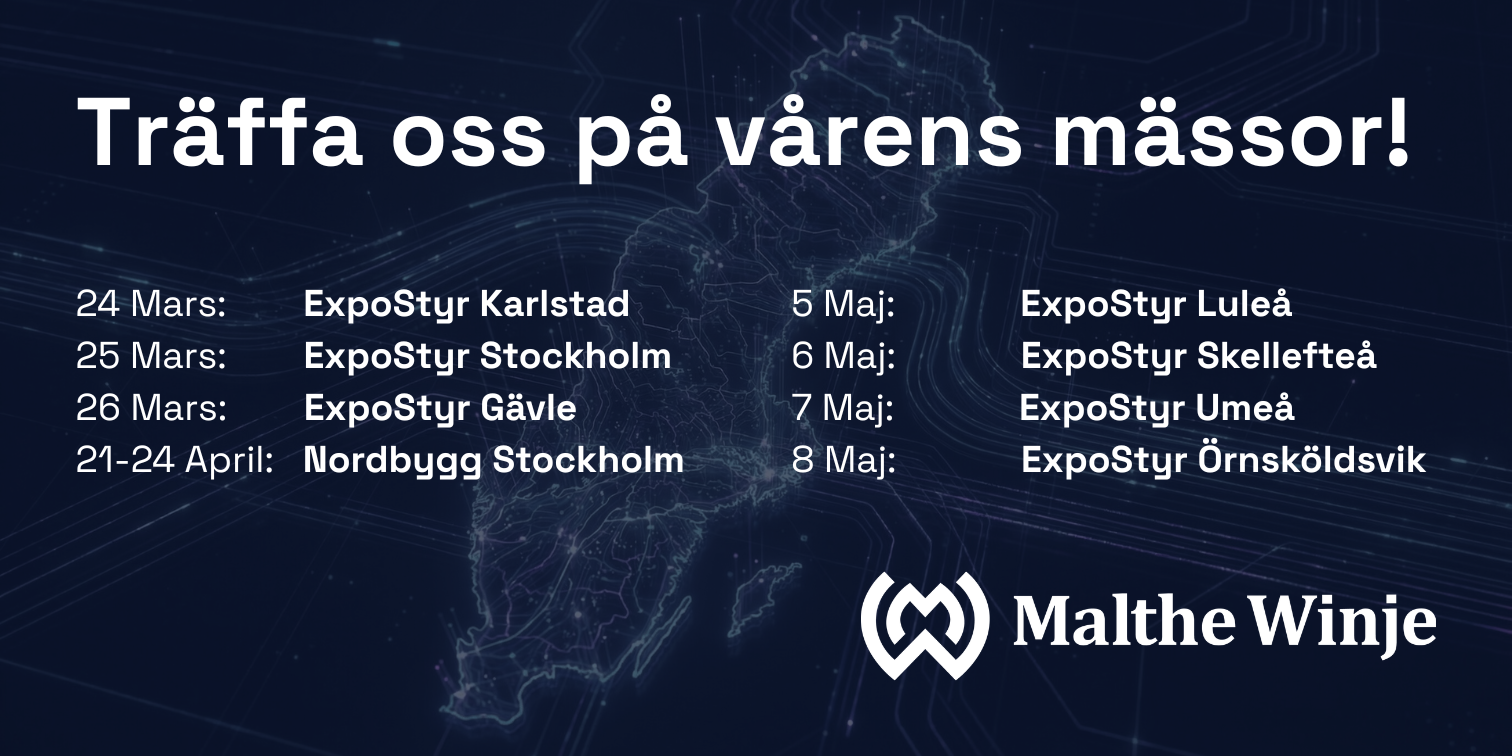 I vår deltar Malthe Winje på flera mässor runt om i landet och vi ser fram emot att träffa dig! Kom förbi vår monter för att diskutera projekt, ta del av produktnyheter och upptäcka smarta lösningar som hjälper dig att lyckas. Oavsett om du är kund, partner eller bara nyfiken på våra produkter eller senaste nyheter är du varmt välkommen.